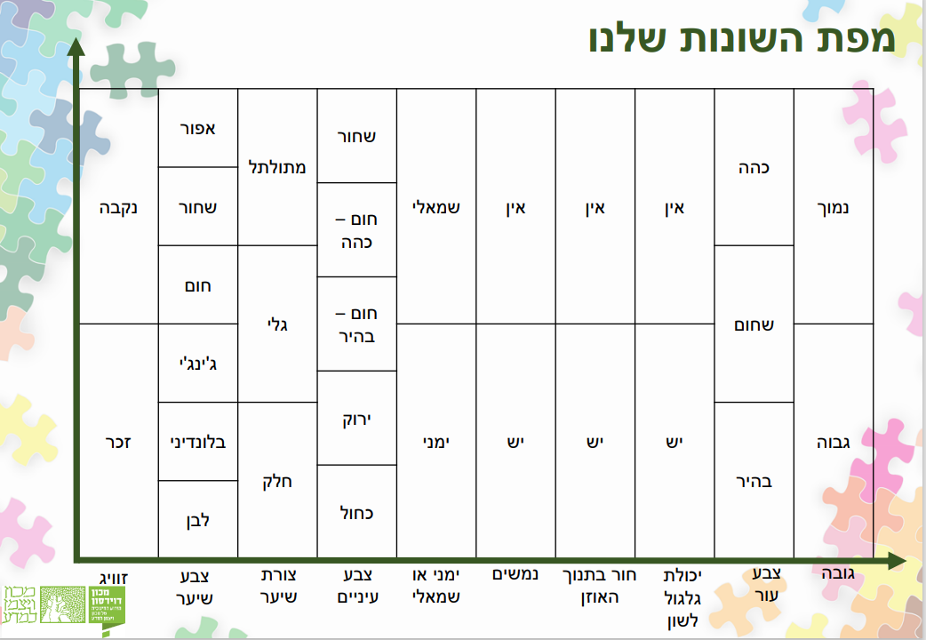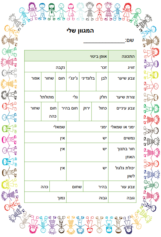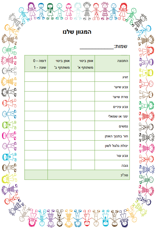 (מצורף כקובץ PDF בתחתית העמוד).ניתן להביא לכיתה מראה גדולה שתסייע לקטלג את התכונות החיצוניות של כל משתתף. המשתתפים ממלאים דף אישי: "המגוון שלי".